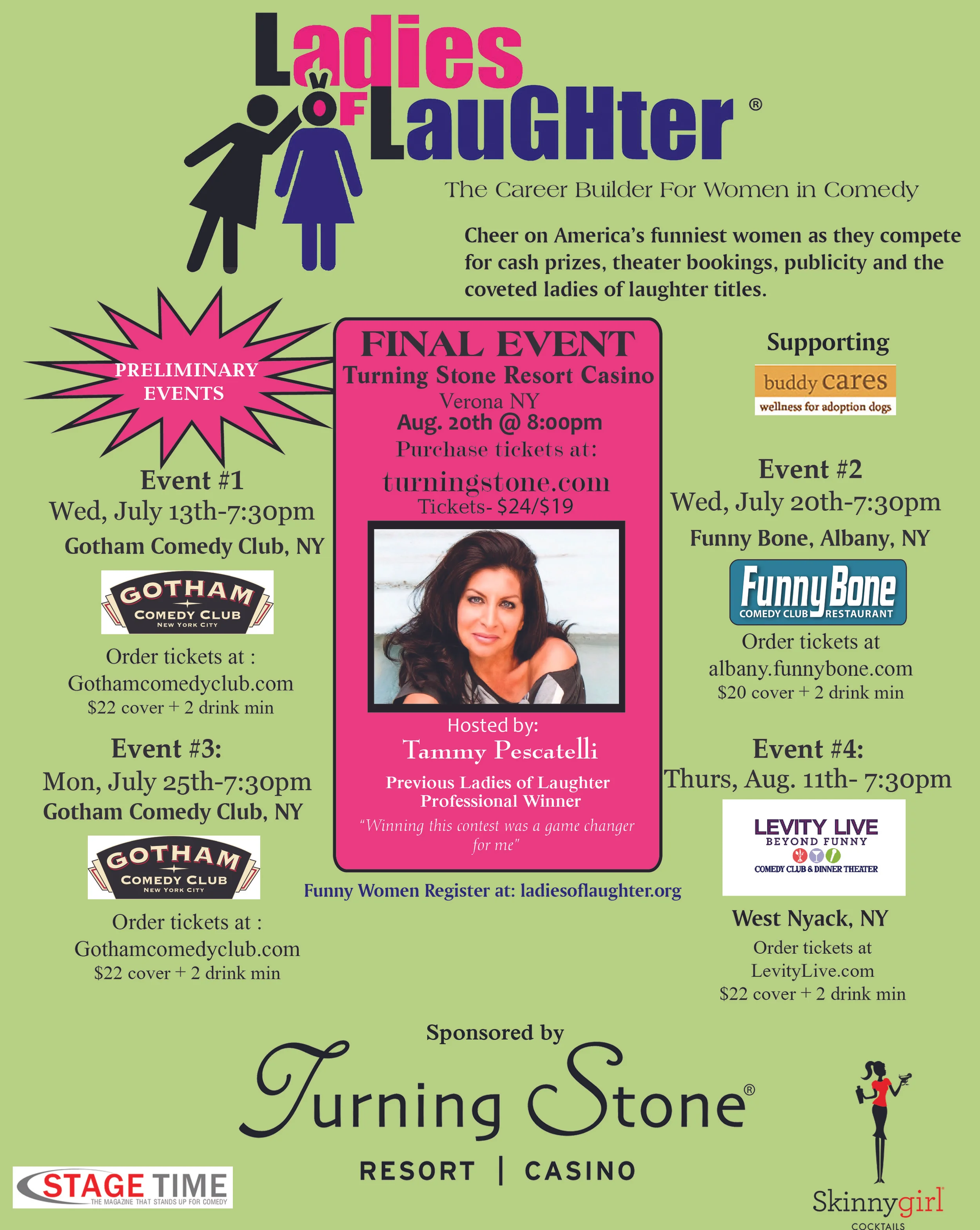 Winners from each preliminary event will go on to the Turning Stone Resort Casino in Verona, NY on August 20th and perform before top comedy industry executives and cheering crowds. The event will be hosted by past Ladies of Laughter® Professional Winner and national headliner, Tammy Pescatelli.
